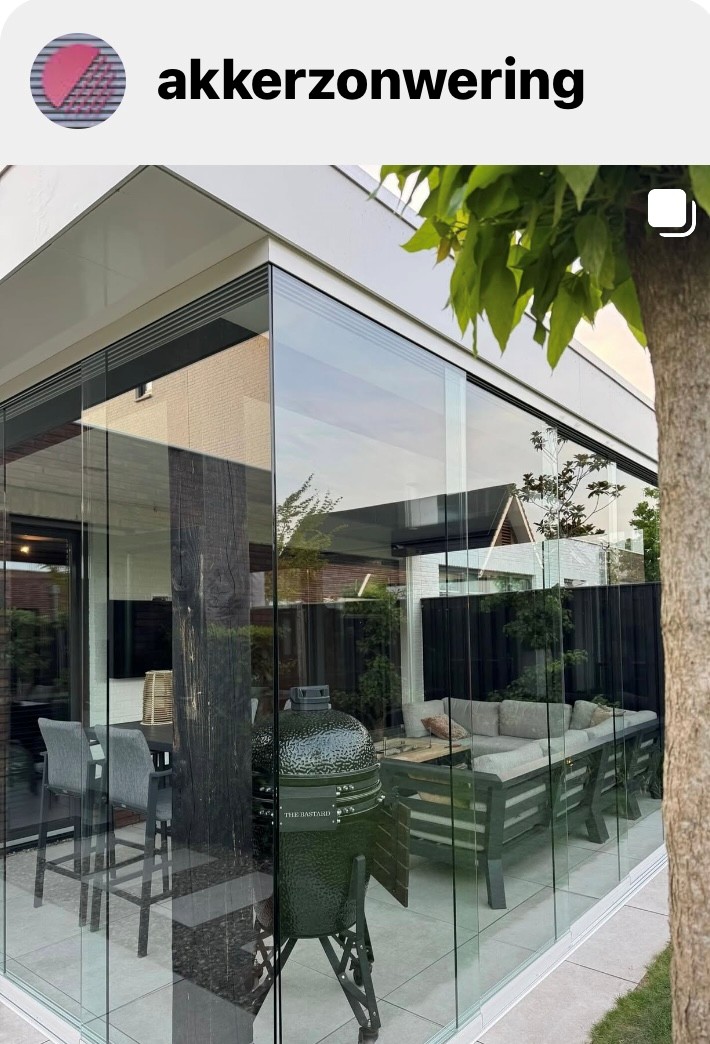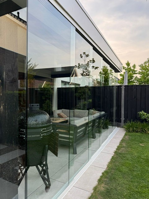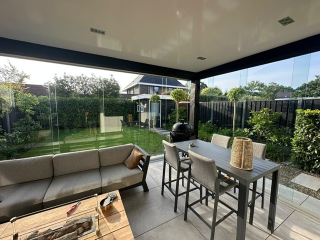 Onze glaswand maakt van uw terrasoverkapping de ultieme flexibele buitenruimte. Ongeacht welk seizoen, u zult hierdoor langer van het buitenleven kunnen genieten.